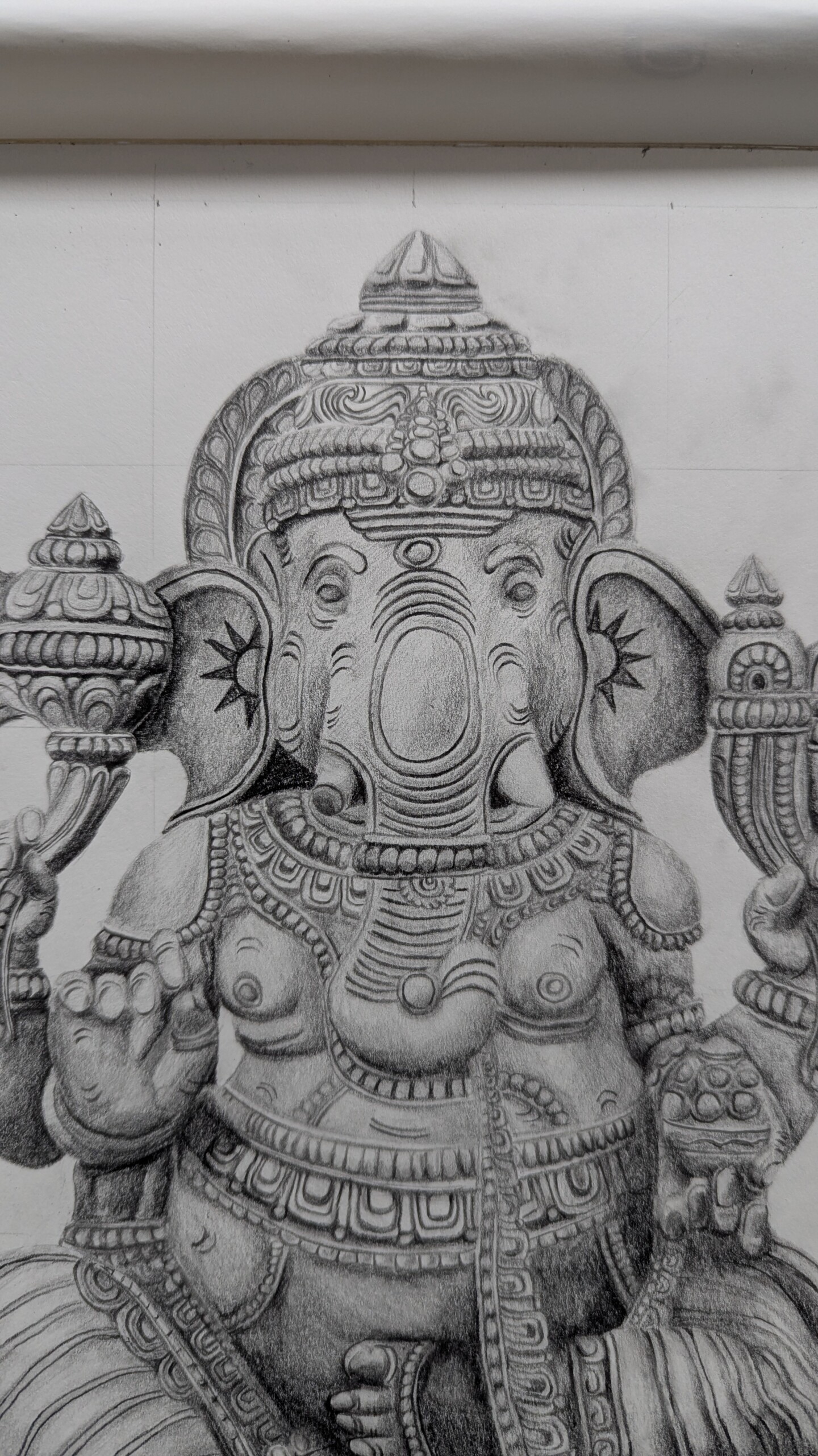 This is a pencil sketch/shading of Lord Ganesh. Light and shadow areas are beautifully shaded, and added lot of details, to make this very beautiful Lord Ganesh. The artist (Sanjitha, a school student) has spent more than 20 hours to make this artwork. After completion, the Artwork is carefully framed in a custom frame.